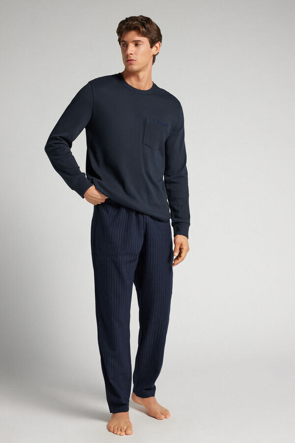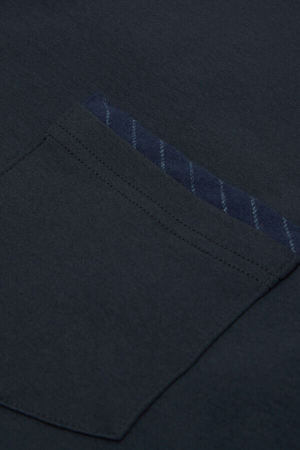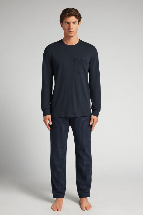 full length pajamas in cotton interlock with solid color top featuring a pinstripe print detail pocket. full length pinstripe pants.