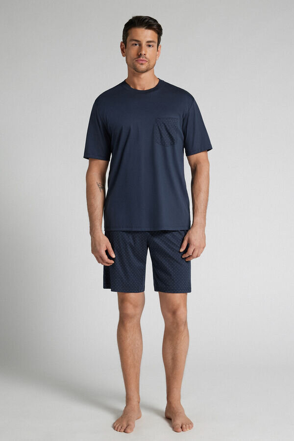 short pajamas with soft solid color premium mercerized cotton shirt featuring a pocket with dot pattern. the shorts also feature the dot print.