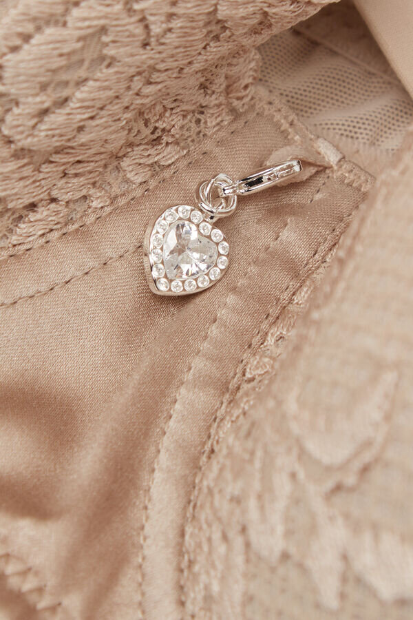 sofia balconette bra made with stretch silk satin cups and embellished with a refined stretch lace that features floral embroidery and an elegant stretch silk satin underband with a lovely heart shaped charm with rhinestones at the center. it is a bra that naturally shapes with maximum comfort, and is perfect to mischievously wear exposed beneath a neckline or see-through top.
