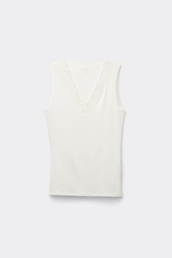 soft modal tank top with neckline trimmed with an elegant floral motif lace ruffle.