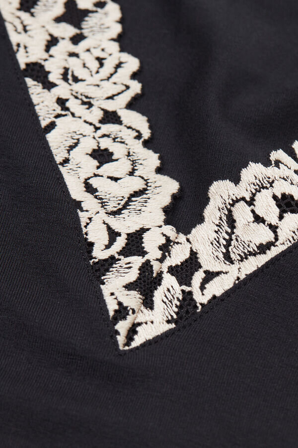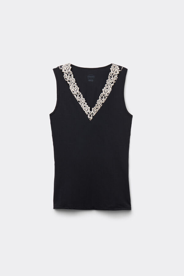 soft modal tank top with neckline trimmed with an elegant floral motif lace ruffle.