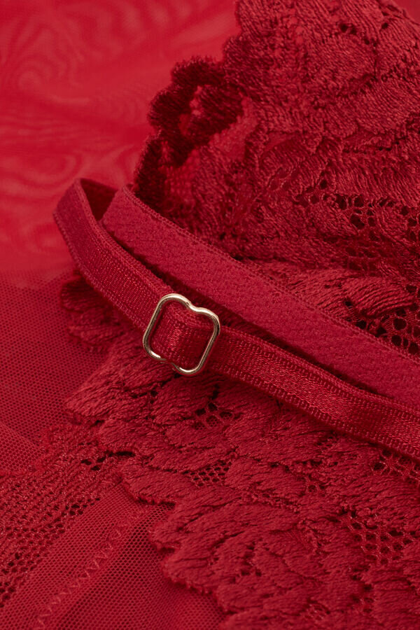 sensual tulle and lace bodysuit with v-neckline. based on the color chosen, the lace can be of contrast color or tone-on-tone. fully adjustable elastic straps. snap button closure and inner gusset in 100% cotton.