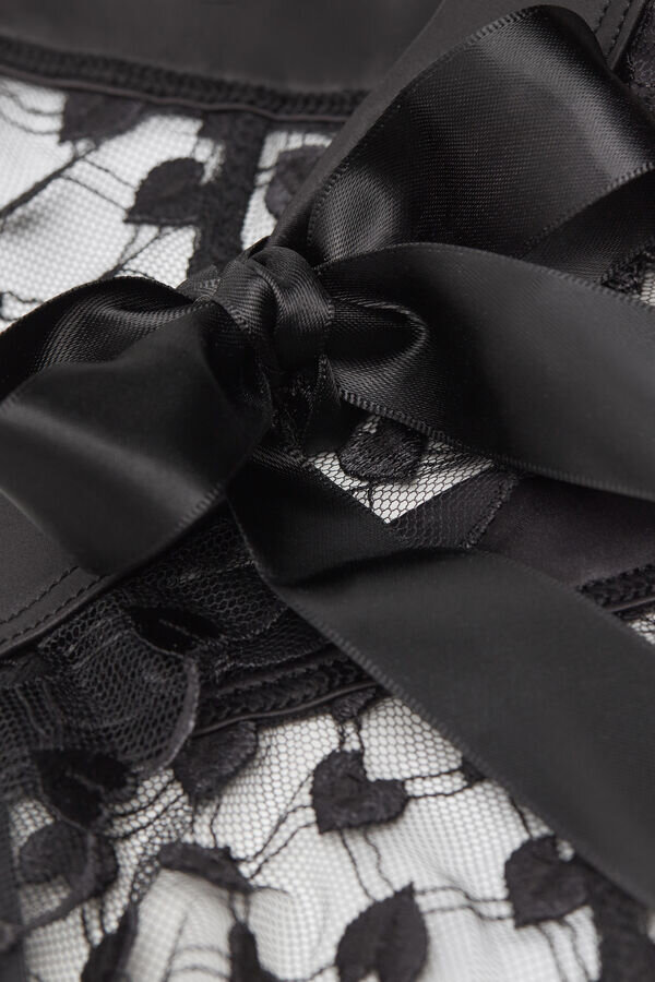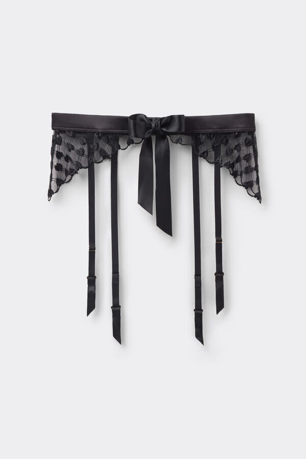 garter belt in romantic heart-embroidered tulle and sensual satin trim. the satin strap is removable and may be also used as a mischievous choker or hair accessory.