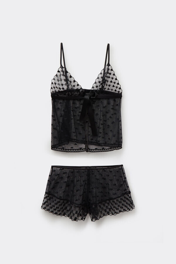 mischievous set in romantic heart-patterned tulle embellished with sensual satin trim and heart-embroidered tulle. the satin strap is removable and may be also used as a mischievous choker or hair accessory.