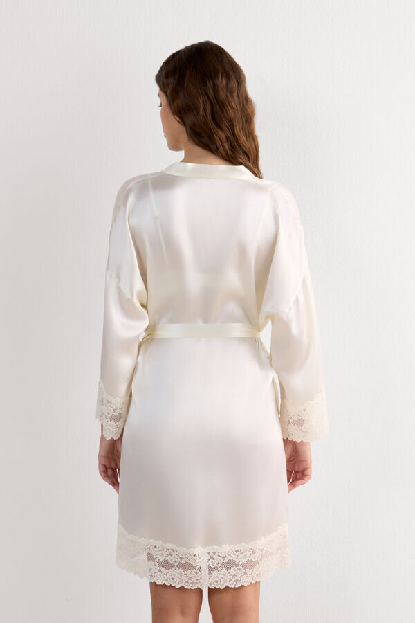 elegant and refined silk kimono with beautiful lace ruffle trim.