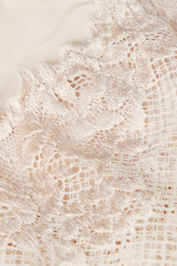 high-waisted hipster brazilian made of a lace ruffle with a soft microfiber lower part. based on the color chosen, the lace can be of contrast color or tone-on-tone. high cut sides. inner gusset in 100% cotton.