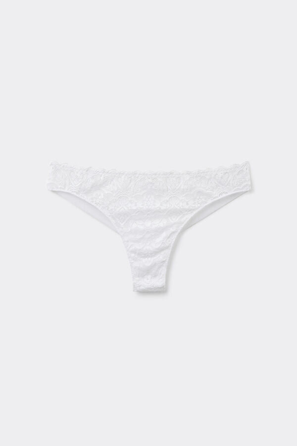 discover intimissimi’s lace and microfiber brazilian briefs, featuring stretch lace with a geometric design, romantic frills, and a soft double-layered microfiber back