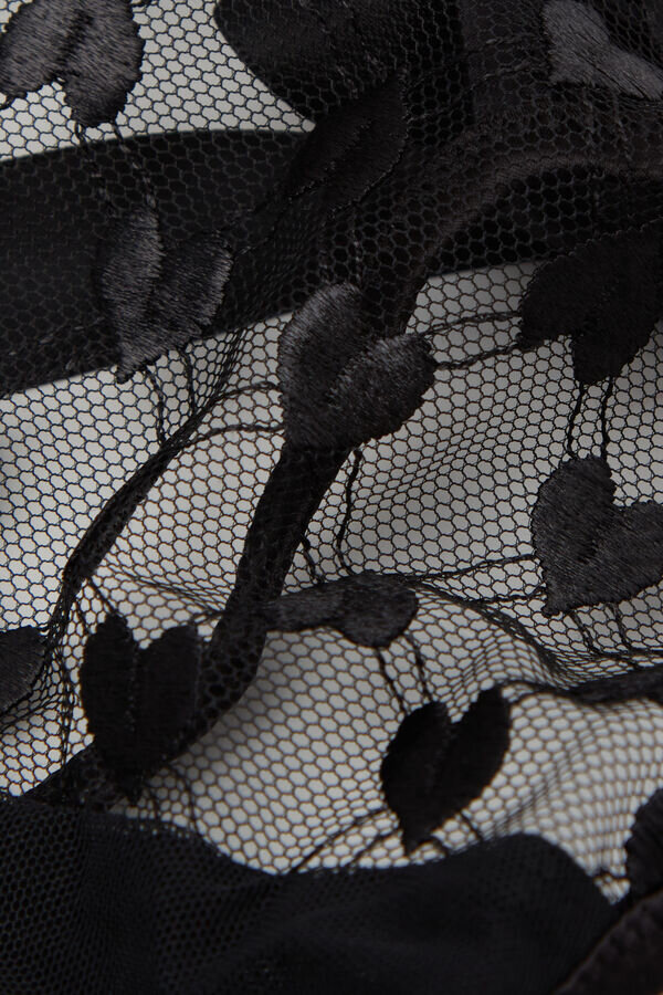 thong in romantic heart-embroidered tulle and sensual satin trim. the satin strap is removable and may be also used as a mischievous choker or hair accessory.
